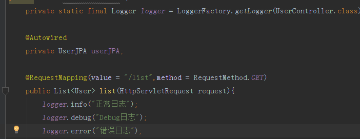 我们在logback.xml配置文件中,添加了控制台输出、文件每天输出、日志文件最大上限、日志的最低级别等。下面我们来运行下项目查看我们的配置是否起作用了,修改我们的UserController内的list方法并添加多个日志级别的输出,如下图所示