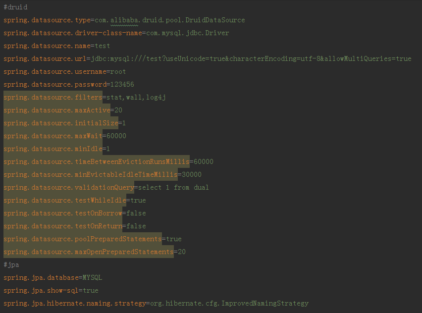 我们已经将druid添加到我们的项目中,那么接下来我们需要修改application.properties配置文件,添加druid的支持,并配置JPA的 show-sql 用来在控制台输出JPA自动生成的sql语句如下图所示: