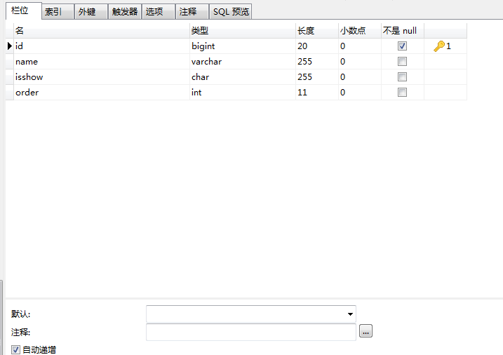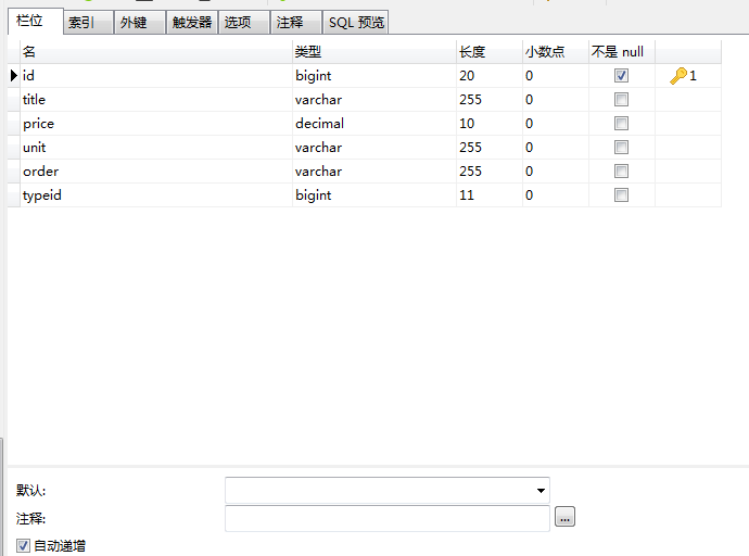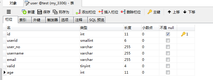 上述数据配置文件已经完成,接下来我们新建数据库测试表结构我使用的数据库工具是Navicat你们可自行下载或者使用其他工具,结构如下: