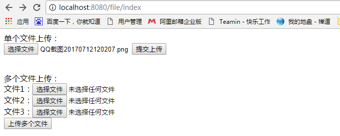 运行项目后,控制台打印日志并没有什么异常,访问 127.0.0.1:8080/file/index 看下效果,如下图