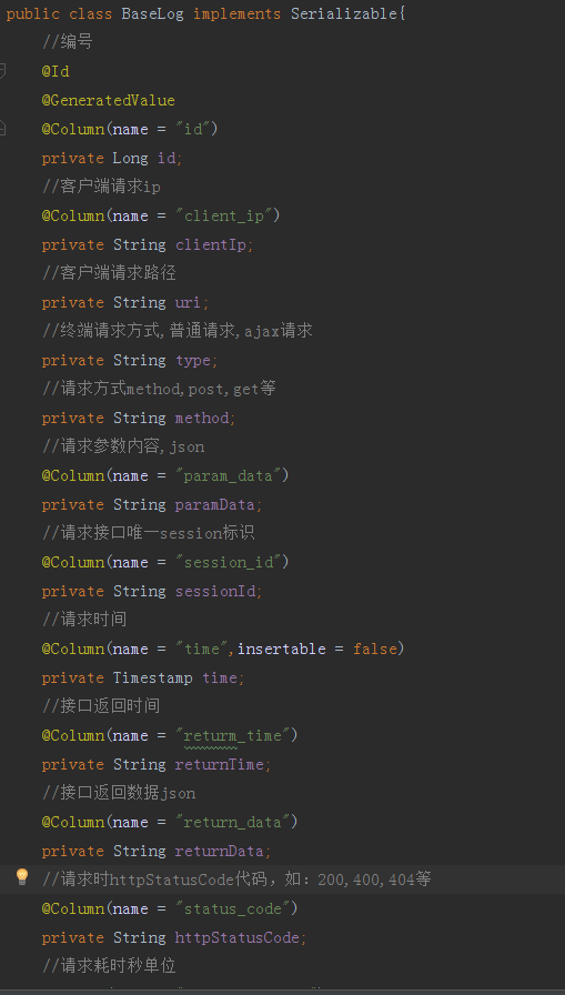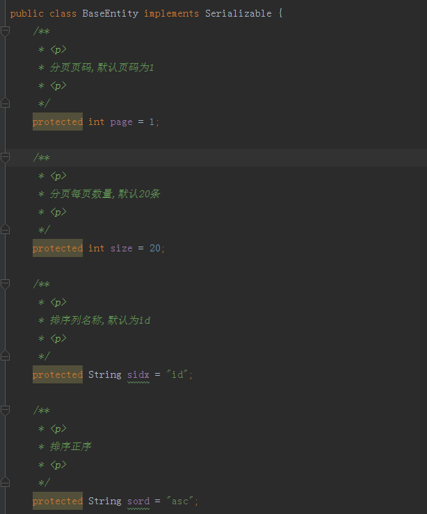 一般情况我们会创建一个BaseEntity,在BaseEntity内添加几个字段:排序列,排序方式,当前页码,每页条数等,下面我们也来创建这么一个父类,代码如下图