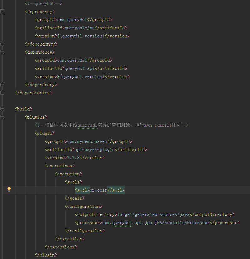 在SpringBoot项目内使用queryDSL需要导入maven依赖以及添加maven插件,修改pom.xml配置文件添加querydsl依赖以及插件如下图