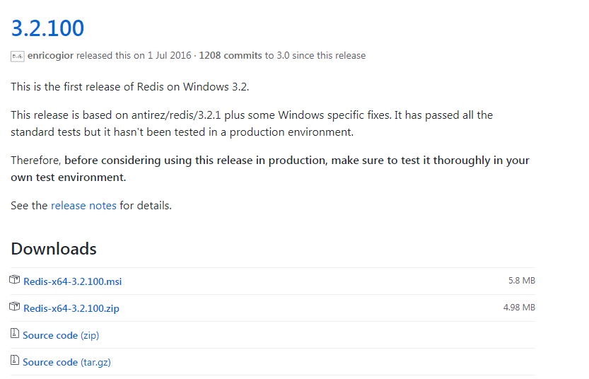 平时在项目中设计数据访问的时候往往都是采用直接访问数据库,采用数据库连接池来实现,但是如果我们的项目访问量过大或者访问过于频繁,将会对我们的数据库带来很大的压力。为了解决这个问题从而 redis 数据库脱颖而出, redis 数据库出现时是以非关系数据库的光环展示在广大程序猿的面前的,后来 redis 的迭代版本支持了缓存数据、登录session状态(分布式session共享)等。所以又被作为内存缓存的形式应用到大型企业级项目中。现在实现 SpringBoot 项目中整合 Redis 非关系数据库作为内存缓存框架,并测试数据读取源。官网的 redis 仅支持Linux服务器的安装版本,由于开发人员都是在windows上工作,所以GitHub上的牛人基于linux平台下的Redis实现了windows版本。github网址: MicrosoftArchive/redis ,下载最新的windows X64版本的压缩包,如下图