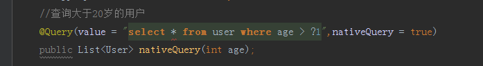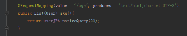 Query是用来配置自定义SQL的注解,后面参数nativeQuery = true才是表明了使用原生的sql,如果不配置,默认是false,则使用HQL查询方式。我们在UserController内添加方法/age,测试我们的自定义SQL是否有效,代码如下图