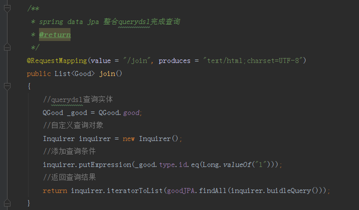 我查询的是分类为1的商品列表,可以看到数据完全正确的给我们返回了,这个仅仅是QueryDSL自己完成的操作,接下来我们使用SpringDataJPA整合QueryDSL完成相同的查询效果。打开GoodController添加join方法,代码如下图