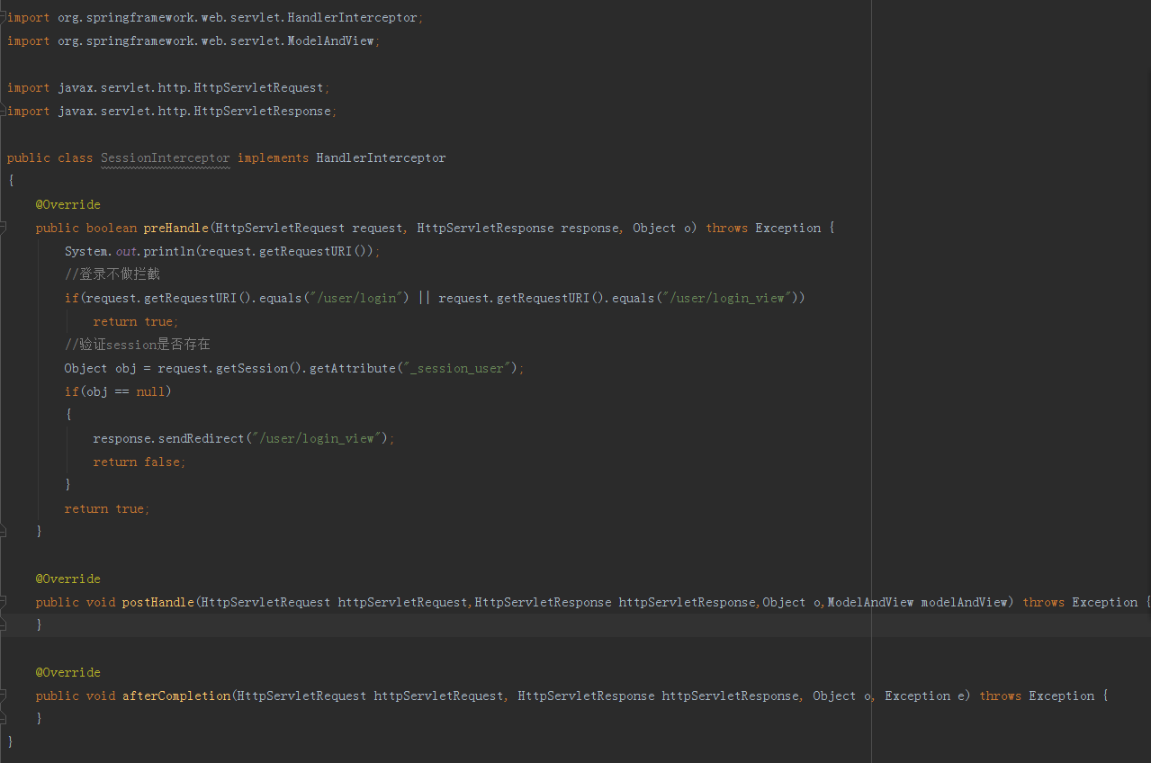 完成上述操作后,创建一个名叫做 SessionInterceptor 的拦截器实体类,实现 SpringMVC 内部接口 HandlerInterceptor, 并且添加如果没有session状态直接跳转到 /user/login_view 地址也就是我们对应的login.jsp页面,拦截器配置如下图所示: