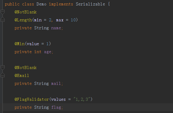 初始化验证消息方法内你可以得到配置的注解内容,而验证方法则是你的验证业务逻辑。我们先来创建Demo实体类,加入flag字段并且配置@FlagValidator自定义注解,如下图