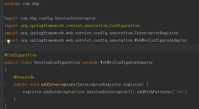 接下来我们需要将SessionInterceptor拦截器添加到SpringBoot的配置中,让SpringBoot项目有这么一个拦截器存在,我们新创建一个SessionConfiguration,将拦截器的配置以及拦截路径配置好,如下图所示: