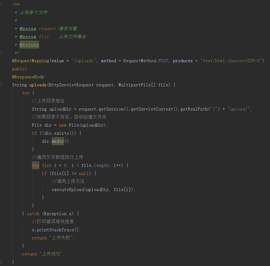 一般情况下我们不会使用上传时文件的名字作为存储在服务器端的名字,通常采用UUID或者时间戳的形式来保存,此处采用UUID形式存储。接下来试验下多文件上传,控制里加入如下代码