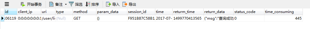 至此已经完全完成,启动项目访问user/list接口可以看到数据库里面已经存入了日志记录如下图: