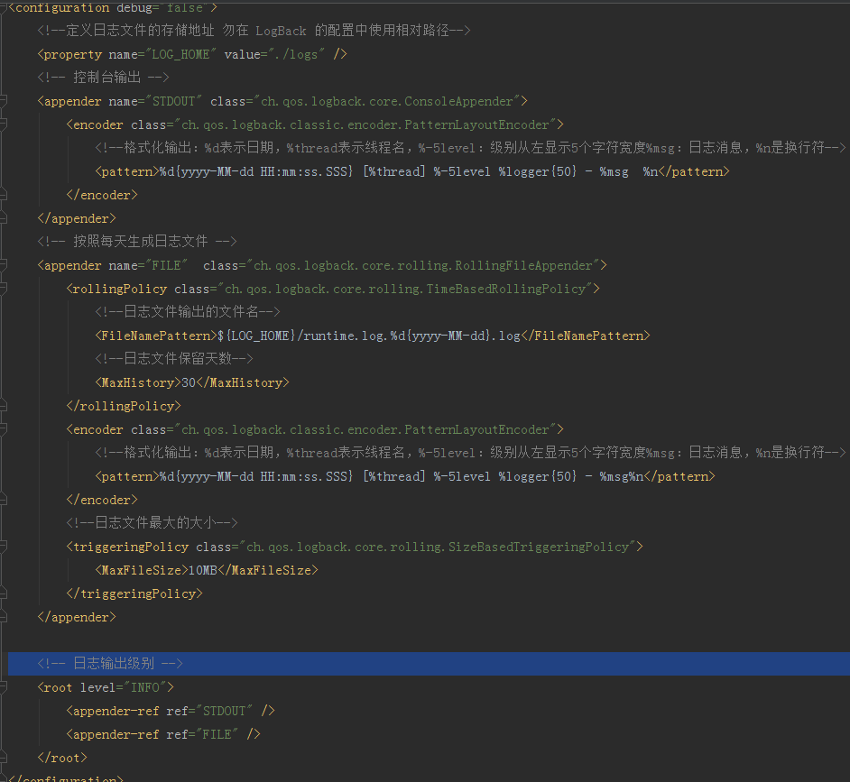 可以看到Debug级别的日志没有输出,只有INFO以及ERROR级别日志打印并输出到文件中。我们配置的./logs作为日志的输出根目录,所以LogBack自动在我们的项目根目录下创建名叫做logs的文件夹,并且项目启动时第一次记录日志时会自动创建命名方式文件。 如果在项目中需要屏蔽某个或者多个包下不输出日志也不记录日志到文件内,那么我们需要修改application.properties添加对应配置,如下图所示