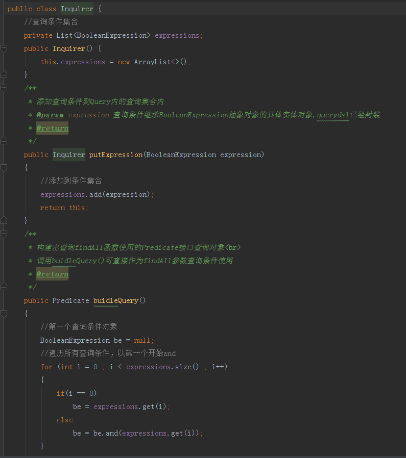 Inquirer,相对于单独的QueryDSL查询而言,整合的方式会更复杂一点,所以可以封装简单的查询对象来简化代码。自定义查询实体类,该类可以完成查询添加封装,查询结果处理操作,具体代码如下图