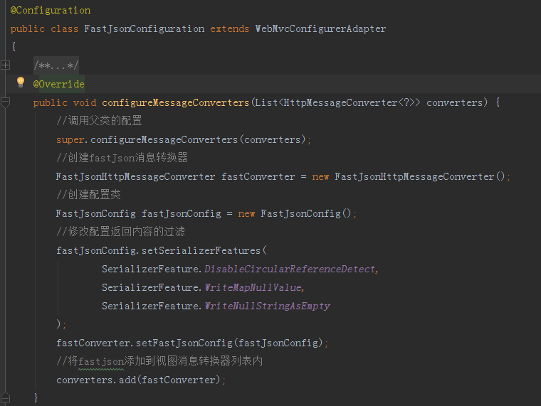 接下来创建一个 FastJsonConfiguration 配置信息类,添加 @Configuration 注解让SpringBoot自动加载类内的配置,有一点要注意我们继承了 WebMvcConfigurerAdapter 这个类,这个类是SpringBoot内部提供专门处理用户自行添加的配置,里面不仅仅包含了修改视图的过滤还有其他很多的方法,包括我们后面章节要讲到的拦截器,过滤器,Cors配置等。