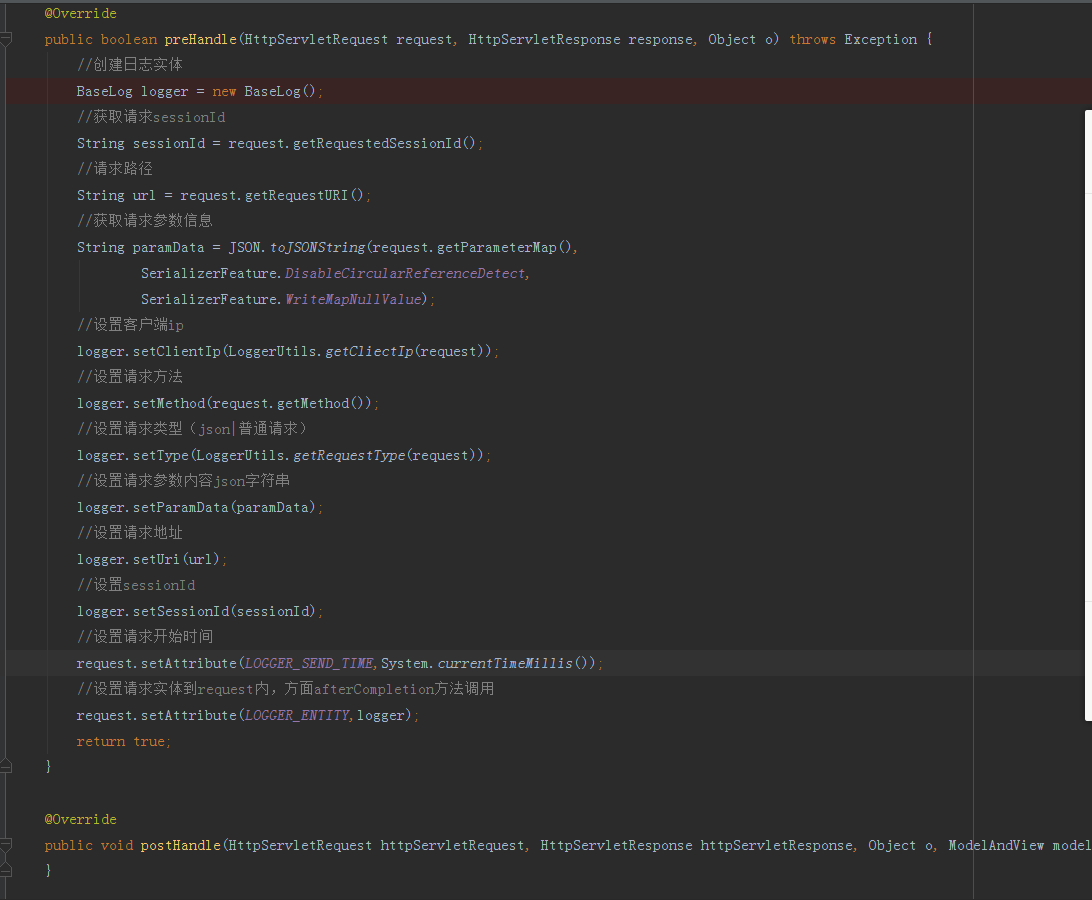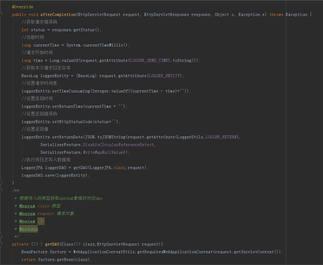 我们在拦截器内无法通过 SpringBean 的方式注入 LoggerJPA ,我只能通过另外一种形式,WebApplicationContextUtils可以通过 HttpServletRequest 请求对象的上下文( ServetCotext )获取Spring管理的Bean,可以看到上图最后创建了一个getDAO的方法,方法需要传入一个实体的类型,以及一个HttpServetRequest请求对象,通过WebApplicationContextUtils内部的getRequiredWebApplicationContext方法获取到BeanFactory(实体工厂类),从而通过工厂实体的getBean方法就可以拿到SpringDataJPA为我们管理的LoggerJPA持久化数据接口实例。我们开始编写请求日志的创建,首先我们在 preHandle 方法内创建LoggerEntity实体,并记录一些必要参数后将实体写入到当前请求对象HttpServletRequest内。可以看到我们上面记录了我们日志实体内的大部分参数,当用户发送请求时在进入SpringMVC的控制器之前会进入 preHandle 方法,然后记录下我们的请求日志内容,并将请求日志的实体写入到请求对象内,下面就会进入对应springMVC控制器方法的方法,在最后渲染视图即将返回前台的时候开始执行我们下面需要边写的 afterCompletion 方法,在 afterCompletion 方法内记录了请求相应码、请求时间戳、请求返回值等。