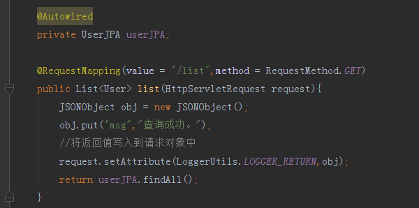 我们在UserControll控制器内list方法里添加如下图代码,可以看到我们在拦截器内的疑问得到的解释,LOGGER_RETURN是从我们的请求方法传入到LoggerInterceptor拦截器内afterCompletion方法中的,如下图: