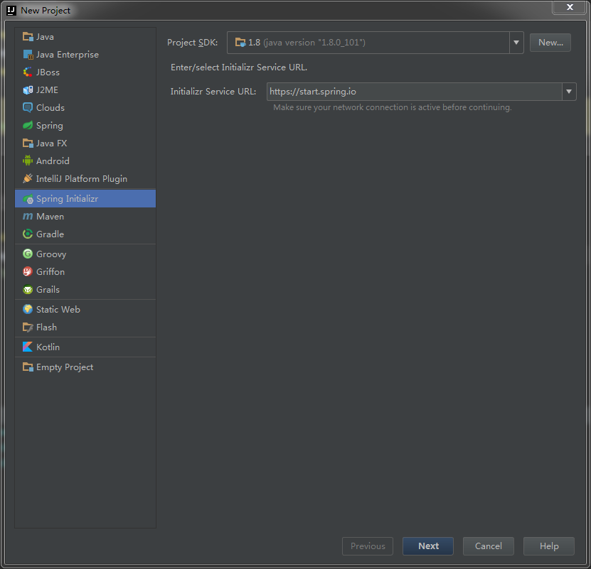 打开Idea,file》new》project》Spring Initializr,选择对应的jdk,如下图所示: