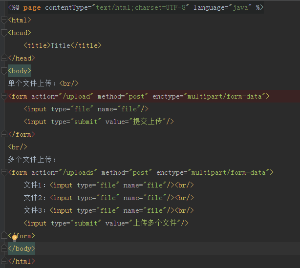一般SpringBoot项目用到Servlet的地方还是较少的。有了SpringMVC也就慢慢的淡忘了Servlet的使用。下面我们来完成单个、多个文件的上传,首先在jsp目录下创建一个fileupload.jsp,jsp内我们添加一个简单的form表单,并且修改 enctype="multipart/form-data" ,fileupload.jsp代码如下图所示