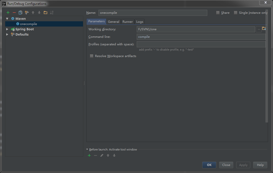 上面导入的querydsl的maven依赖,下面的插件很重要,当我们执行 maven compile 命令的时候,queryDSL这个插件会自动在我们配置的目录下生成Qxxx结构化查询实体对象,querydsl完全采用面向对象的方式来创建查询。接下来需要让maven执行querydsl的插件自动生成查询实体对象,先配置项目的maven命令,添加一条compile,点击:Run -> Edit Configurations -> "+" -> Maven,配置如下图