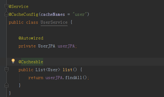 上述就是有关Redis的所有配置,现在来创建一个业务逻辑服务类: UserService ,我们在Service内添加redis的缓存支持,如下图