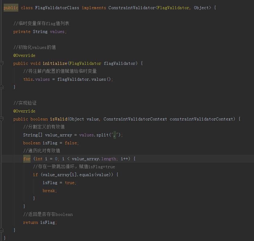 可以看到上图9内有个 @Constraint 注解,里面传入了一个 validatedBy 的字段,这个就是我们自定义注解的实现类的类型, 实现类 代码如下图