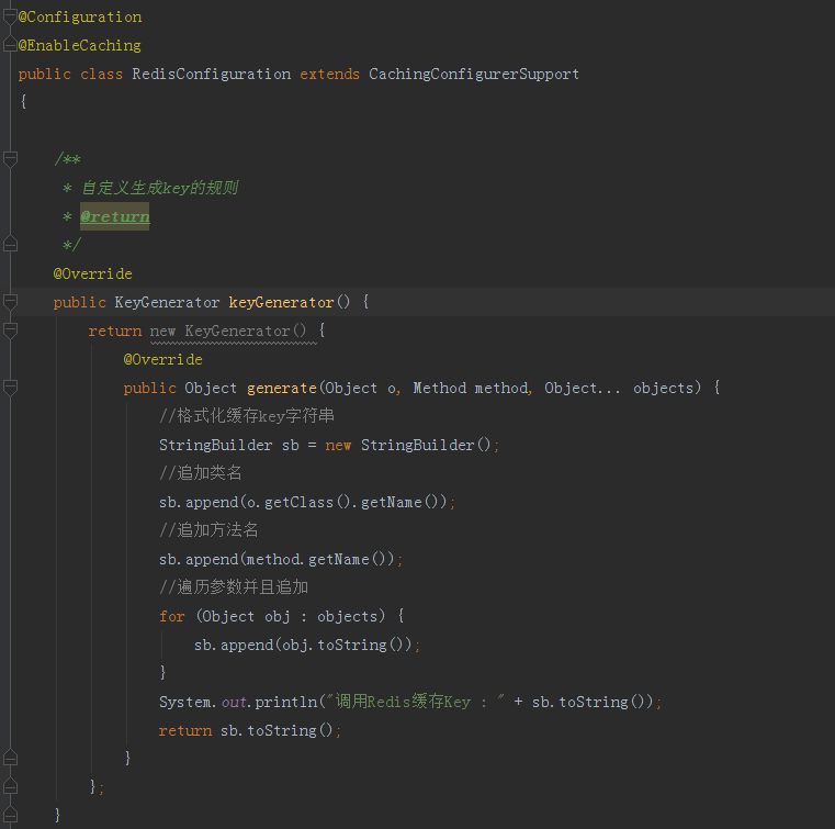 下面需要让SpringBoot内置的缓存框架使用Redis作为新的缓存,我们来添加一个RedisConfiguration的配置类,并添加对应的配置如下图