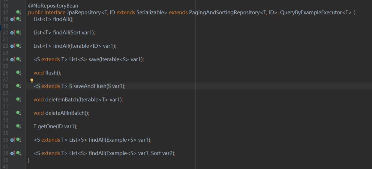 我们自定义的接口继承了 JpaRepository ,也就是说我们的UserJPA拥有了JpaRepository接口及父类接口的所有方法实现,所以我们并不需要添加任何数据操作代码就可以完成数据操作,JpaRepository接口对条件查询以及保存集合数据添加了对应的方法,如下图