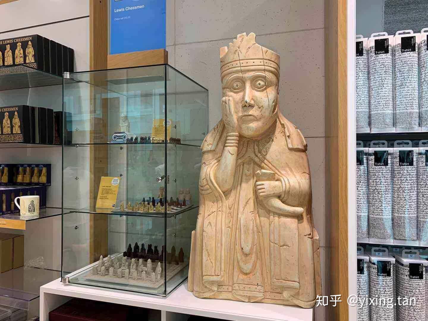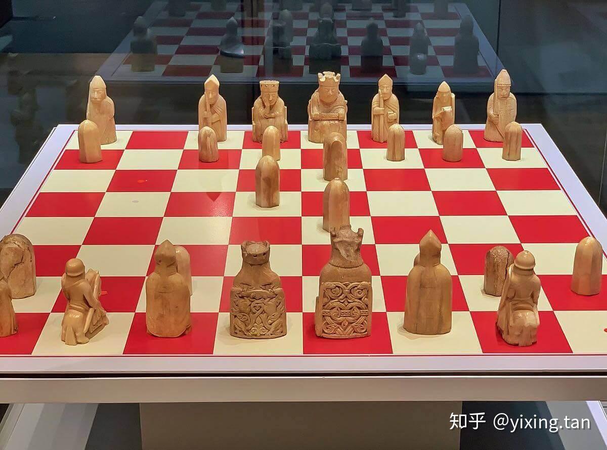 这个有点小网红啊,因为这些棋子都丑萌丑萌的。这可能是这个博物馆最可爱的文物了。而且还是哈利波特里巫师象棋的原型。推测是在公元一世纪在西部群岛做的,当时西部群岛还属于挪威而不是现在的苏格兰。一共发现了78个棋子,11个底座,和1个皮扣。材料是海象牙和鲸鱼牙。大部分在大英博物馆产出,还有一部分在爱丁堡的国立博物馆。其中部分棋子成员还有世界巡展,前年来中国国家博物馆呆了三个月呢。国际象棋最早源自印度,后来传到中东,南欧,西班牙,再到英国。在每个国家流行也都会入乡随俗,比如在中东国王旁边是男谋臣,伊斯兰世界里女性不能非常抛头露面。而在欧洲棋盘上国王旁边是皇后,有趣的是这个棋盘上的八个皇后都是捂着脸。