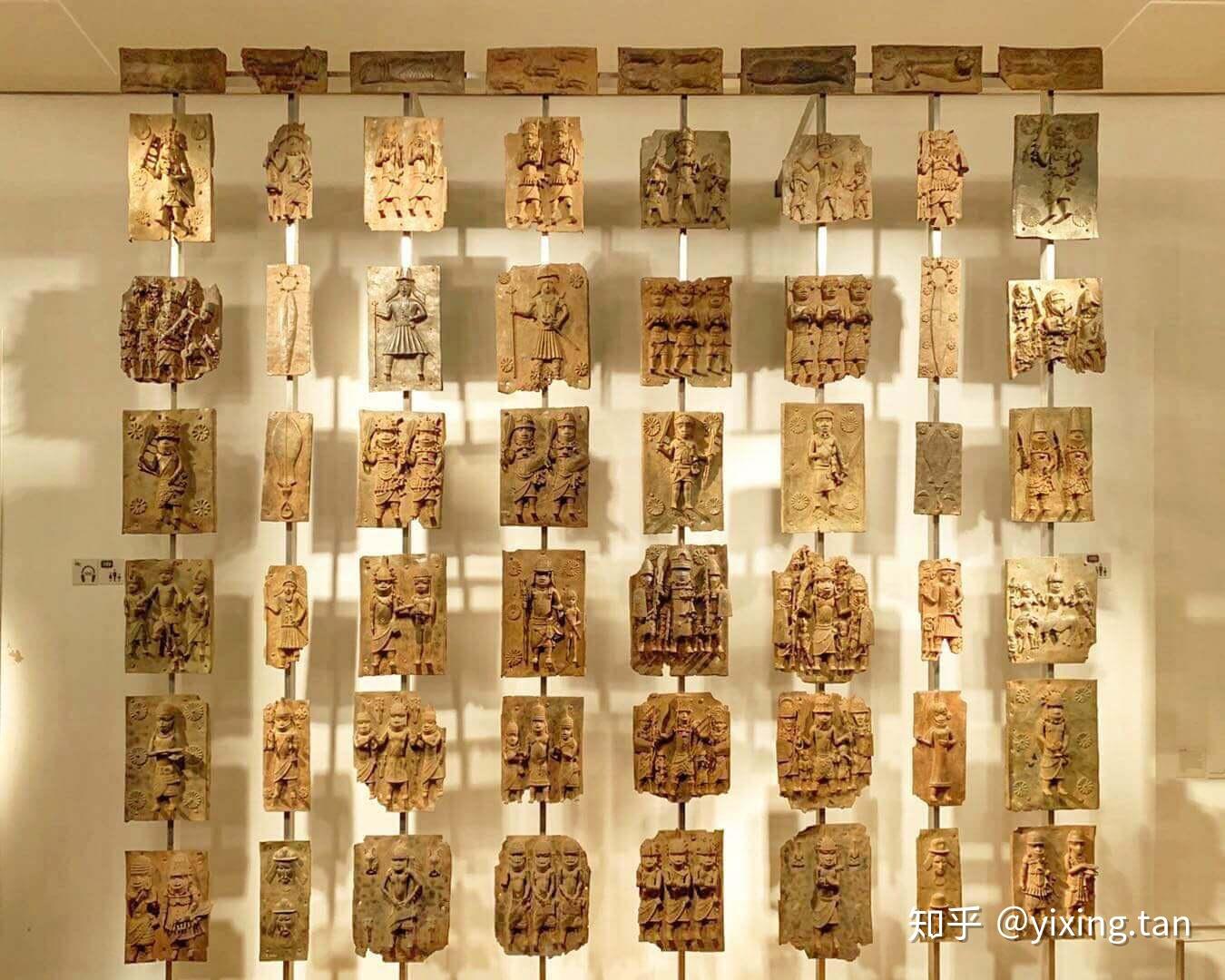 在非洲馆你一定会被这么一面墙给吸引了。整面墙的青铜浮雕都来自贝宁。贝宁古城在中世纪是非洲很发达的经济文化中心,好比非洲的唐朝西安。他们很能雕刻,铜雕,牙雕,木雕等等各种雕刻在那年代简直就是别人家的孩子。也是在那个时候贝宁的雕刻成为一种宫廷的艺术,用来装饰宫殿的大厅和回廊。在贝宁的雕塑里不像欧洲只有高大上的神和统治者,国王,王后为多,太子,达官,僧侣,贵族,武士、猎人,乐师,传教士和随员也可以人人刷个脸。题材就像微信朋友圈,有的吹捧丰功伟绩,有的就记录一个生活小日常。他们对人物的造型似乎还认真贯彻落实一个标准,比如国王或王后雕像基本上都是凸额头,大眼睛,直鼻梁,厚嘴唇,圆下颏。