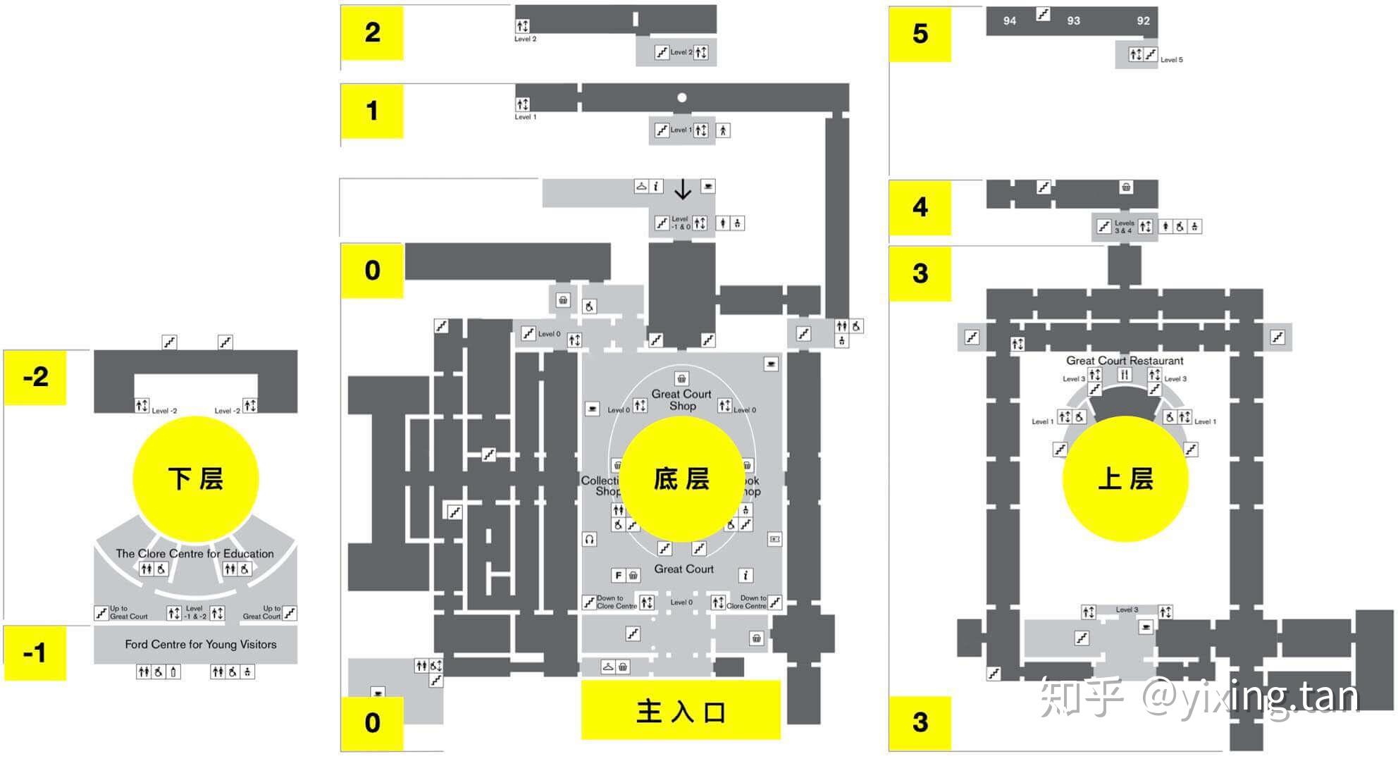 我们先来了解下大英博物馆这建筑是怎么分布的。首先按照层高,大英博物馆一共分为三部分。一进门是底层部分,底层部分是0楼1楼和2楼,上层部分是3楼4楼与5楼,下层部分是-1楼与-2楼。这也是官方的分层,我在官方的地图上做的标识,看下面的图哦。