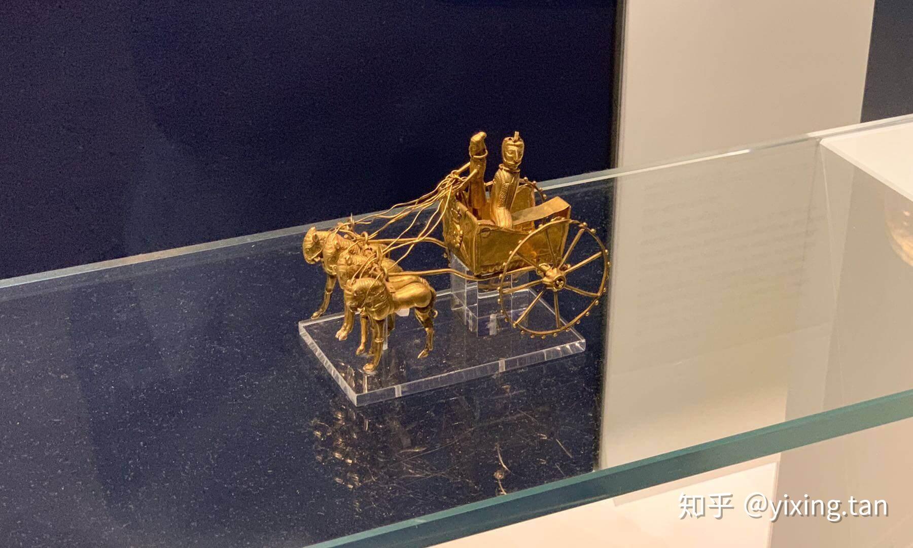 这个模型战车是是阿契美尼德在公元前550年到公元前330年的王朝时期遗留下来金银藏品。发现的地方在赫提库瓦德(Takht-Kuwad),就是今天的塔吉克斯坦和阿富汗边界。这是在中亚的奥克瑟斯河域发现的宝藏中最著名的一件。四匹马拉着战车,两个人一个站着一个坐车,坐着的是马夫,站着的推测是波斯王朝的一位官员,因为外衣和头饰都比较好看吧。这车的轮子都跟马一样高了,应该是用来跑长途的。历史上庞大的波斯王朝核心地带在现在的伊朗,西至土耳其和埃及,东跨阿富汗和巴基斯坦。很多路是在那时候开始修的,所以波斯王是历史上一位伟大的铺路王。宗教在波斯王朝中可以自由传播,比如,战车的前方的装饰是埃及的侏儒守护神贝斯。