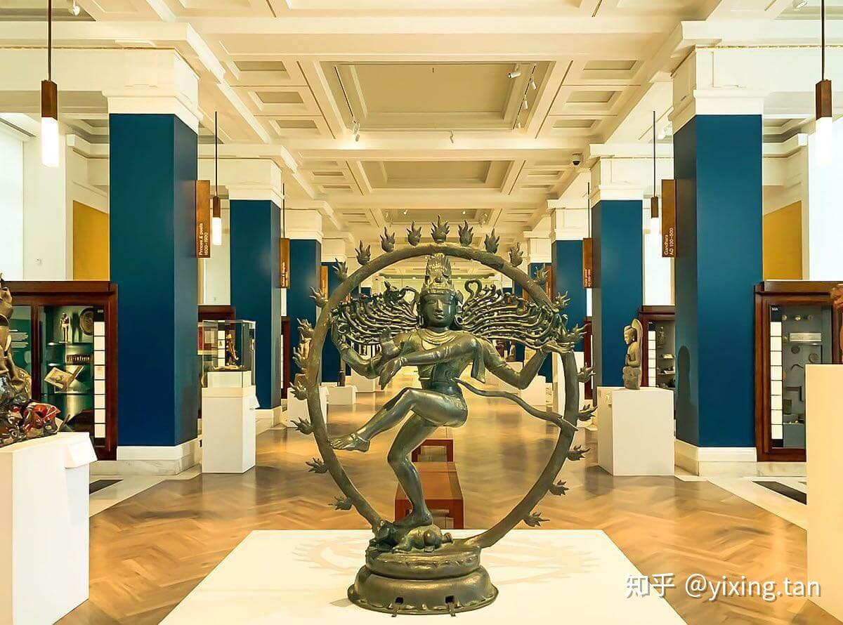印度有个湿婆节,印度教徒相信在那天祭拜可以能够婚姻长久,多子多福。湿婆是印度教里兼具生殖与毁灭、创造与破坏双重性格的主神。湿婆还创造了刚柔两种舞蹈。简单来说就是一个可以一边跳舞一边毁灭世界的神。跳舞当然得有音乐,湿婆可是自带BGM的神。右手拿着创世之鼓,这鼓声被认为是宇宙第一声或者宇宙的心跳。在他的头发里,有一个微小形象是恒河女神,象征神圣的恒河。湿婆脚踏一个小人,有着征服时间的意味。在其他博物馆里收藏的舞王湿婆也有着脚踩一个卑鄙的人或者无知的人。火焰光环象征生成、保存、毁灭的轮回循环过程。