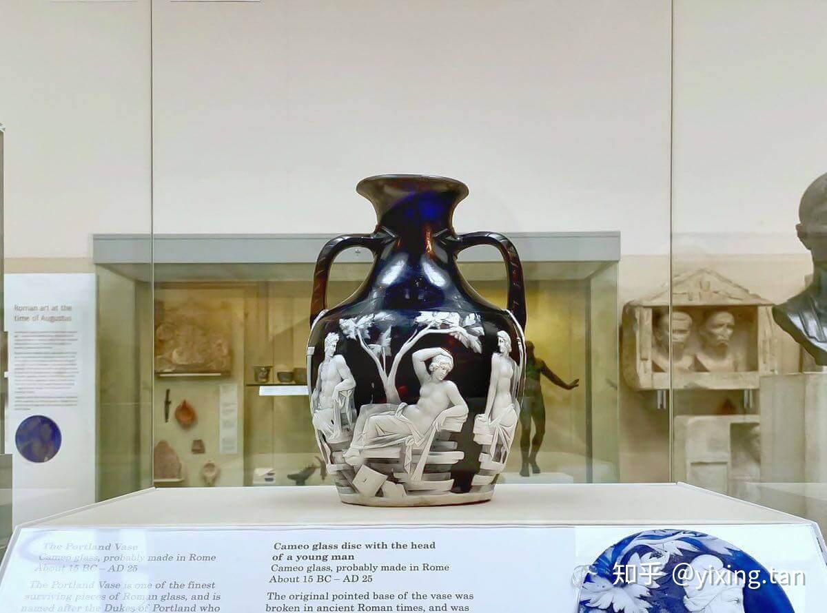 这个花瓶很神秘。号称是现存最精美的古罗马宝石玻璃的制品。基本上古罗马宝石玻璃都是公元前30年后70年内的产物了,这个花瓶当然也是那时候的。上面七个人一条蛇。其中两个年轻男女盯着中间坐着的少妇,少妇抱着的有人推测是水蛇吧。除了手里拿弯弓和火炬的丘比特可以被确定身份,剩下的人和故事从神学和历史学角度有50多个不同解释或猜测,因此花瓶用途比如皇帝礼物,名流奢侈品,骨灰盒等等也众说纷纭。这个奢侈品在社会名流上卖来卖去送来送去,直到1945被大英博物馆买下,但其实这个花瓶已在那里摆了两百多年了。和小伙伴一起考眼力的机会来了,一百多年前有个醉汉冲进来打碎了这花瓶,后来被修复好了后。你能看出破碎痕迹吗?