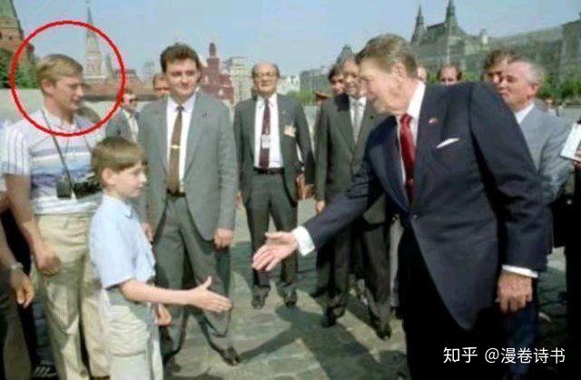 1988年美国总统里根访问苏联,特工普京(画红圈者)化装成记者随护在里根身边。
