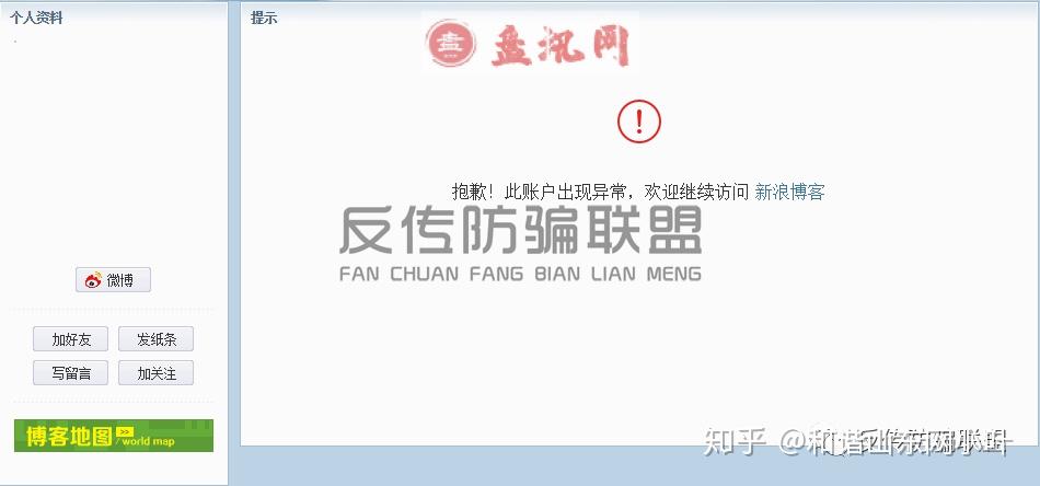 除了公众号被封,小编发现此骗子的新浪博客也因为“帐户出现异常”被封。