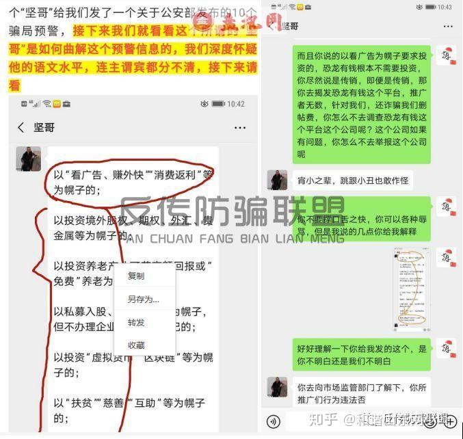 从该截图对话中不难看出,“辉哥”只是轻描淡写的阐述了表面的问题,并没有将其全部的商业模式和盘托出,拿二级分销模式与直销多层次计酬模式相对比,莫名其妙偷换概念,“恐龙有钱”表面上设定两种模式,其实际发展过程中,已然超出法律规定,特别是“收徒”模式,典型的拉人头越多,赚钱越多。 对此,网络上有律师看到“辉哥”的辩白文章后联系到了反传防骗联盟坚哥: