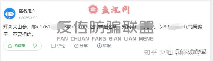 所谓的“辉哥”,侵犯知识产权,你懂吗?不懂的话麻烦你百度一下,并非你口中所谓的文章删除是因为恐龙有钱“合法”。通过其公众号推广所谓的项目来分析,一个惯骗推荐的骗子平台还“合法”?简直是笑话! 回归正题,今天反传防骗联盟继续曝光骗子“辉哥”,真名武某辉,山西人。邮箱:176174xxxx6@qq.com,QQ:1761xxxx06,微信名:辉网络项目组长,(a8xxxabcd),微博:郝x静,公众号:‘辉哥火山会’,‘火山项目’(目前该公众号经腾讯平台审核因“涉嫌多种违规”已被屏蔽)。 其实在反传防骗联盟曝光该骗子之前,网络上已有关于此人的曝光,请看下图(注意看日期,百度一用户匿名举报了“辉哥火山会”纯属骗子,举报日期比本平台的曝光日期整整提前了十天,可见因此人的推广致骗上当的人可不在少数!)