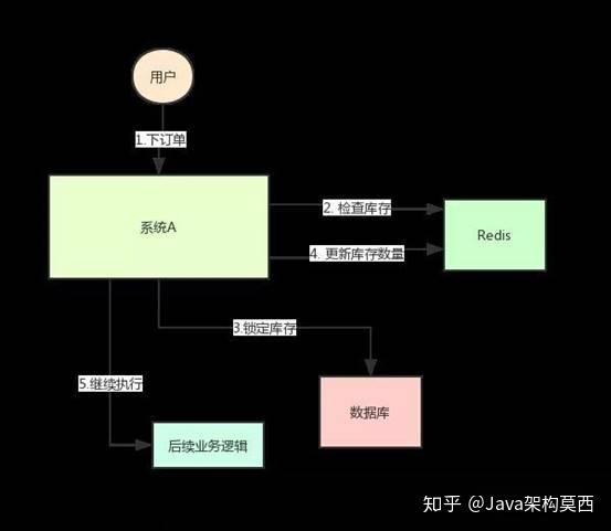 系统 A 是一个电商系统,目前是一台机器部署,系统中有一个用户下订单的接口,但是用户下订单之前一定要去检查一下库存,确保库存足够了才会给用户下单。由于系统有一定的并发,所以会预先将商品的库存保存在 Redis 中,用户下单的时候会更新 Redis 的库存。此时系统架构如下:
