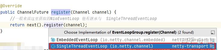 但是,我们发现NioEventLoop相关的实现,但是我们根据前面所学,我们可以知道,NioEventLoop的父类是SingleThreadEventLoop,所以我们进入到 SingleThreadEventLoop#register(io.netty.channel.Channel):