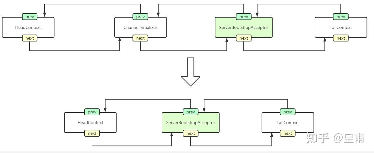 我们会进入到finally里面,我们会看到,此时会做一个操作,删除当前的类,当前的类是谁,是ChannelInitializer,所以删除完毕后,此时管道对象的结构如图所示: