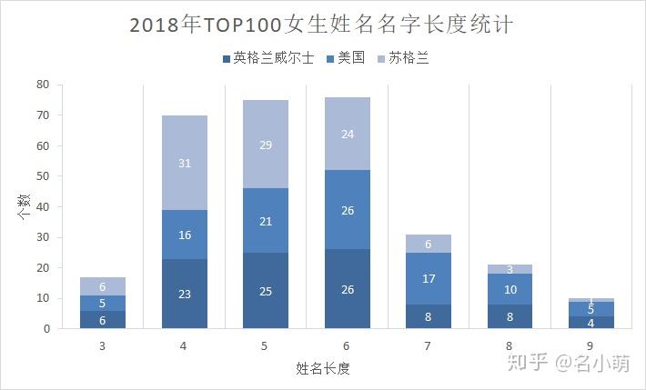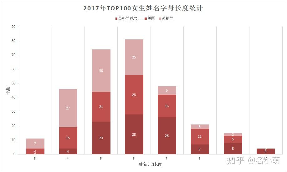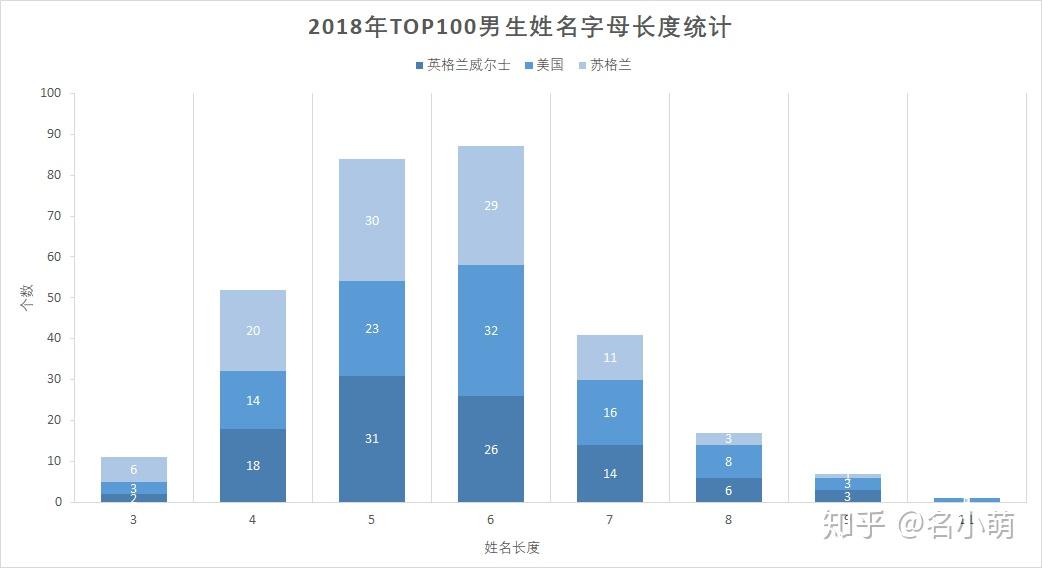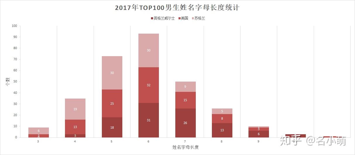 近两年来的TOP100男生姓名字母长度分析可以看出,英美两国都对4-7字母长度的男生名字青睐有加,想要取一个流行的男生英文名,或许并非网络上流行的“名字越短越牛x”。