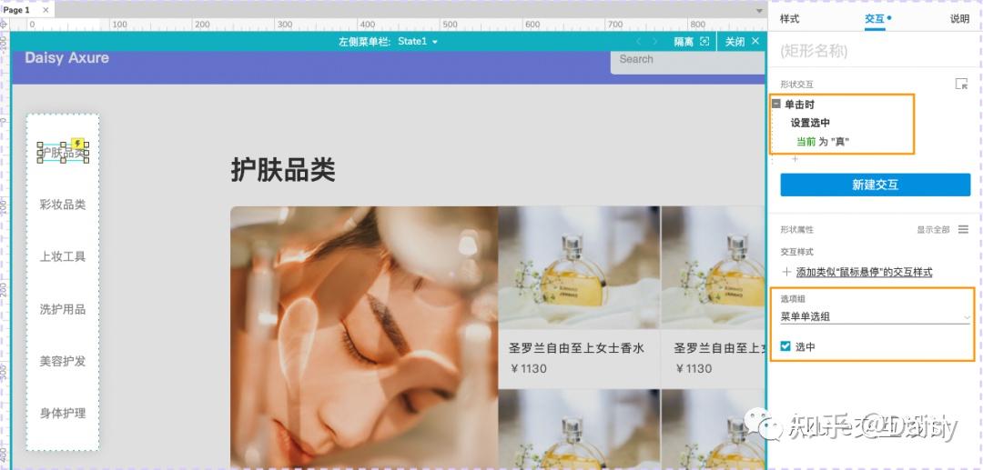 2.在右侧交互面板中分别添加【鼠标单击时】【选中】当前元件的交互,设置选项组名称为「菜单单选组」,默认勾选第一个菜单文本标签为选中状态。