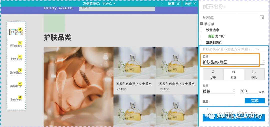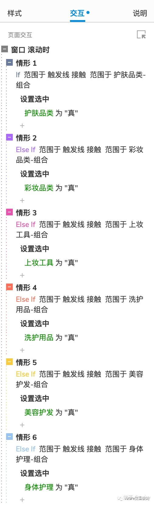 2.在右侧交互面板中选择【页面滚动时】的交互,点击【启用情形】,设置条件【元件范围-「触发线」-接触元件范围-「护肤品类-组合」】,添加动作【选中】左侧菜单的「护肤品类」选项。