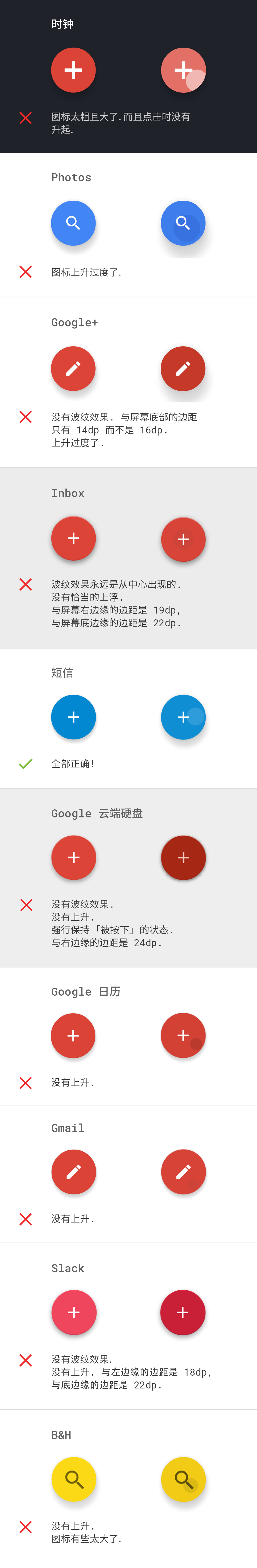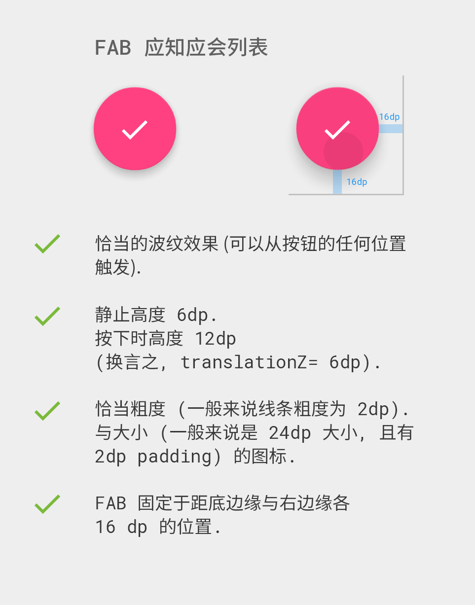 在分析了一些现有应用中的 FAB 之后, 我惊讶地发现, 大家的 FAB 之间有着巨大的差别. 也许对很多人来说 FAB 不过是一个普通的圆形按钮, 但是这个圆形按钮依然有着很多参数设置, 比如 与屏幕边缘的距离 , 图标的大小 , 波纹效果 , 上升与阴影 . 绝大多数时候, 各种第三方库都不能正确的做到这些, 不过, 如果那些应用只有一个 FAB (举个例子, 不需要展开的 FAB), 那想要做到正确应该不至于很难才对.