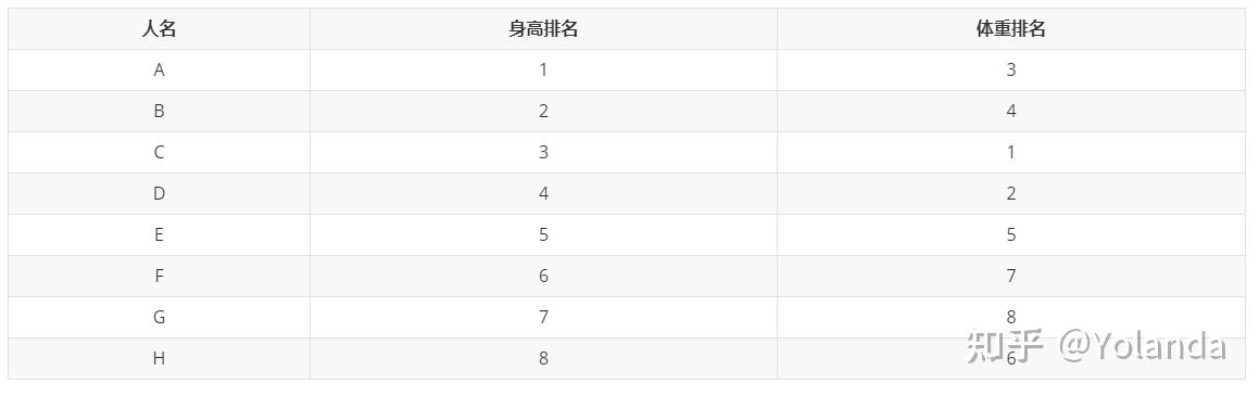 可以看到,两个排名之间的相关性,可以用kendall计算相关系数。A最重,但体重排名为3,比体重排名为4,5,6,7,8的重,贡献5个同序对,即AB,AE,AF,AG,AH。同理,发现B、C、D、E、F、G、H分别贡献4,5,4,3,1,0,0个同序对。因此,同序对数