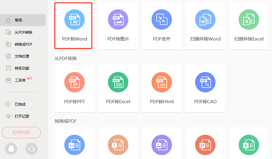 1、打开软件后点击【常用】,然后点击【PDF转Word】功能。
