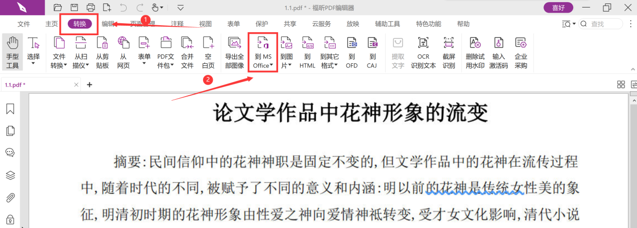 步骤二:点击【转换】功能下的【到MS office】,选择【将文件转换为Word】。