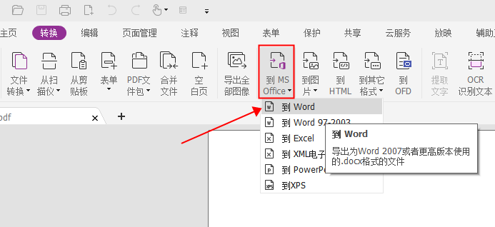 1、首先在软件中打开文件,切换到【转换】页面,然后点击下面的【到MS Office】,选择【到Word】功能