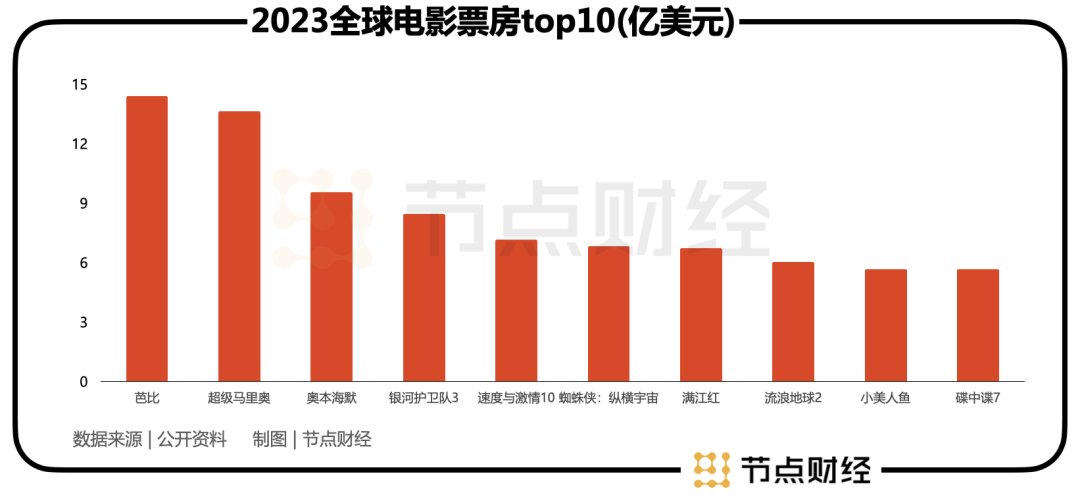 2023全球电影票房排行 top 10中,上榜的国产片只有《满江红》和《流浪地球2》,分列七、八名,其余全部出自英美之手。