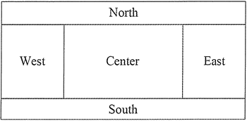 BorderLayout(边框布局管理器)是 Window、JFrame 和 JDialog 的默认布局管理器。边框布局管理器将窗口分为 5 个区域:North、South、East、West 和 Center。其中,North 表示北,将占据面板的上方;Soufe 表示南,将占据面板的下方;East表示东,将占据面板的右侧;West 表示西,将占据面板的左侧;中间区域 Center 是在东、南、西、北都填满后剩下的区域,如图 1 所示。