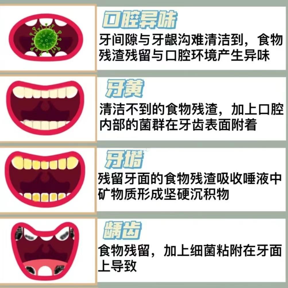 食物残渣都会留在牙缝内,口腔内的健康环境会被破坏,很容易出现口腔异味,牙渍等问题,甚至出现牙结石,重则牙周炎。